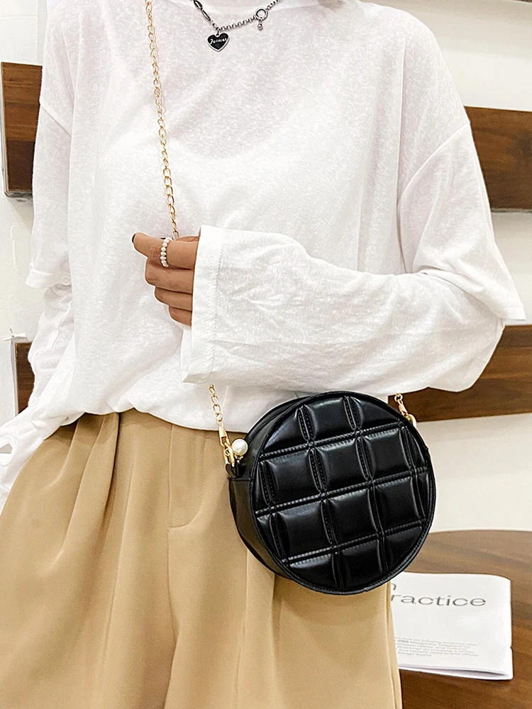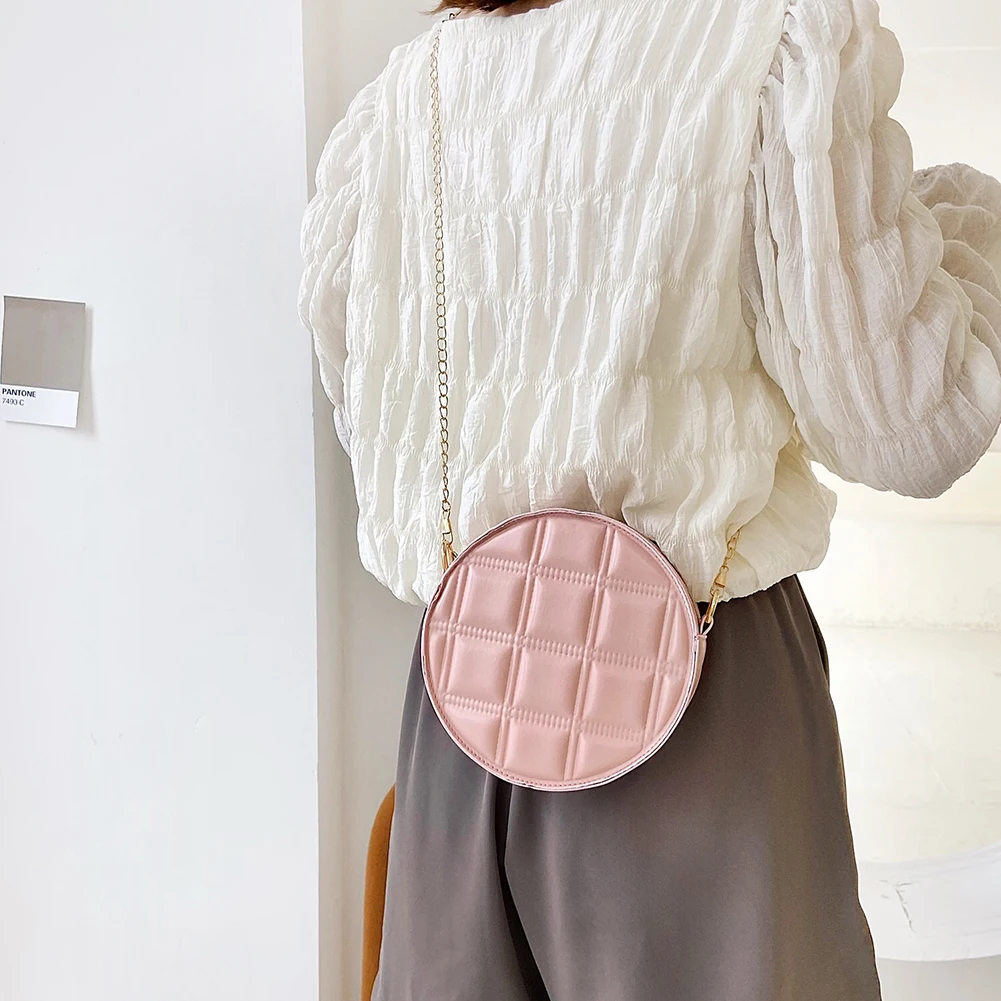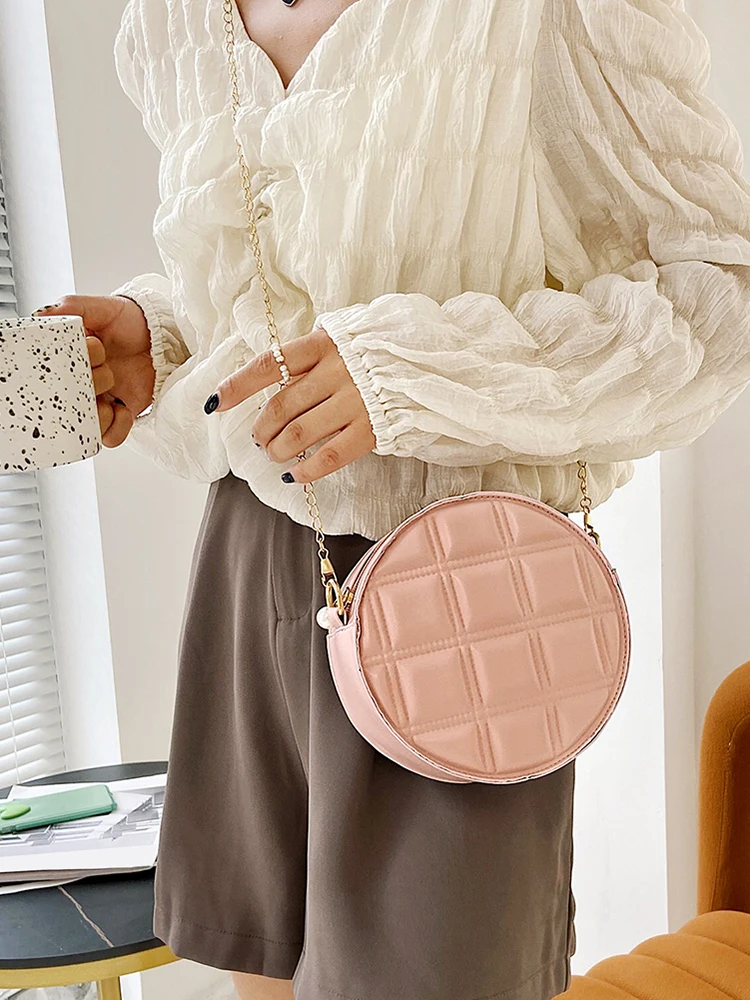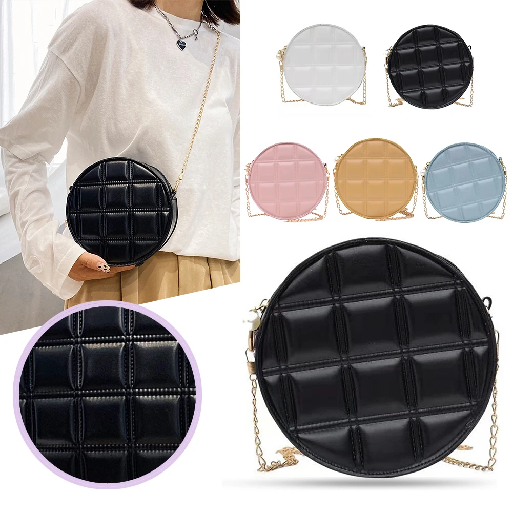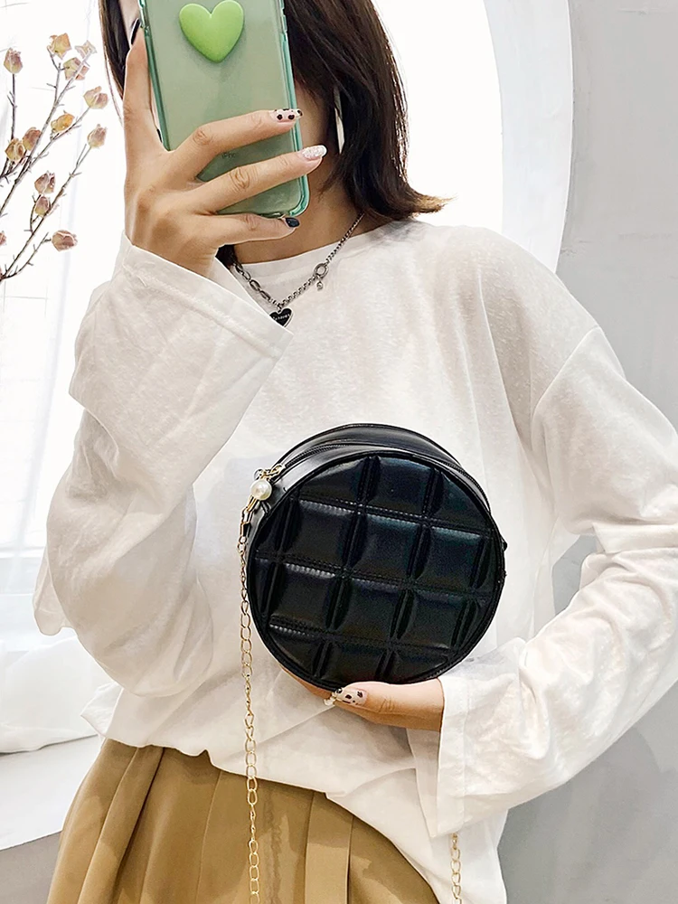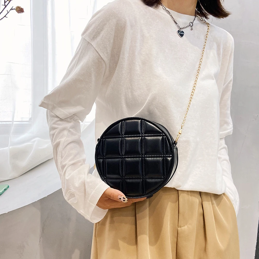 Moda feminina xadrez de couro do plutônio forma redonda corrente ombro crossbody messenger bag casual senhoras mini bolsa bolsas